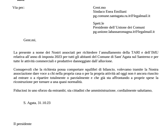 E’ stata inviata una PEC in data 31 ottobre 2023 al Sindaco del Comune di Sant’Agata Enea Emiliani,